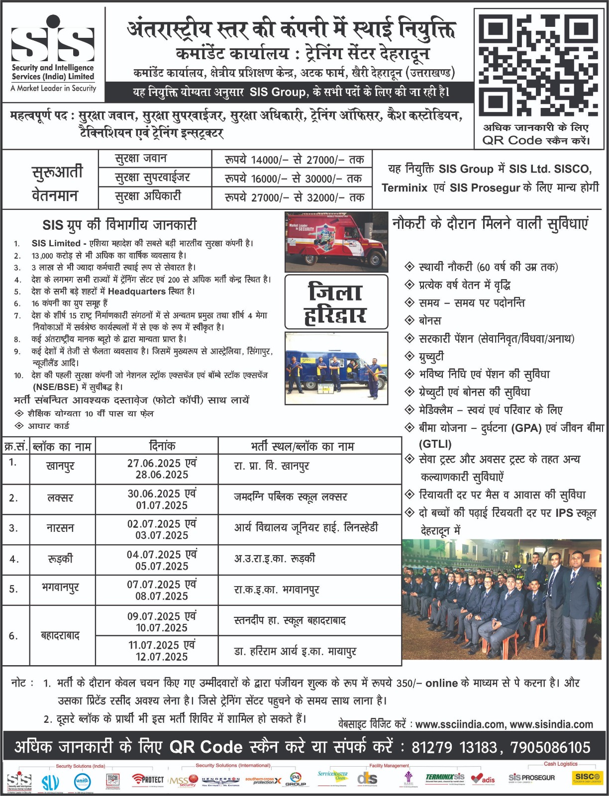 हरिद्वार : जनपद के विकास खण्डों के 07 विद्यालयों में सुरक्षा जवान सुरक्षा सुपरवाइजर की भर्ती शिविर कैम्प आयोजित किया जा रहा है। जिलाधिकारी मयूर दीक्षित से प्राप्त आदेश के क्रम में मुख्य शिक्षा अधिकारी केके गुप्ता ने बताया है कि जनपद के सभी विकास खण्ड के 07 विद्यालय परिसर में एसआईएस इंडिया लि. के तत्वाधान में बेरोजगारों को रोजगार उपलब्ध कराने हेतु शिविर का आयोजन किया जा रहा है। एसआईएस इंडिया लि. भारत की बहुराष्ट्रीय कम्पनी है, जो सुरक्षा प्रदान करने का कार्य पूरे भारत व विदेशो में कर रही है। इस शिविर में सुरक्षा जवान , सुरक्षा सुपरवाइजर की नियुक्ति की जाएगी है। अतः शिविर का आयोजन विद्यालयों में तिथिवार आयोजित शिविर के पूर्ण विवरण के अनुसार निर्धारित कीें गई है जिसमें –