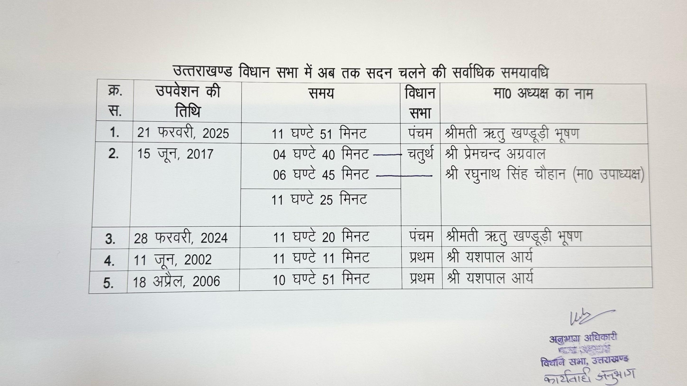 देहरादून : पंचम विधानसभा के बजट सत्र के दौरान, विधानसभा अध्यक्ष ऋतु खण्डूडी भूषण ने 21 फरवरी, 2025 को एक दिन में सबसे लंबा 11 घंटे 51 मिनट तक सदन की कार्यवाही का संचालन कर अपना ही पूर्व का रिकॉर्ड तोड़कर नया रिकॉर्ड बनाया। यह उत्तराखंड विधान सभा के इतिहास में बिना एक सेकंड का ब्रेक लिए बिना अब तक की सबसे लंबी सत्र संचालन की अवधि है। इससे पहले भी उत्तराखंड विधान सभा में लंबे सत्र चलने के कई उदाहरण मिलते हैं, जिनमें प्रमुख रूप से: