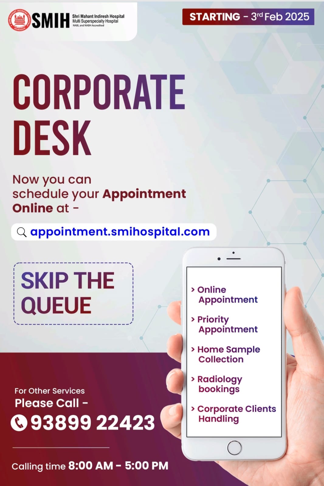 देहरादून। श्री महंत इन्दिरेश अस्पताल में काॅरपोरेट डैस्क की सेवा शुरू हो गई है। इस सेवा के अन्तर्गत मरीज़ ऑनलाइन अप्वाइंटमेंट बुक करवा सकते हैं। इसके लिए आपको appointment.smihospital.com पर जाकर अपना अप्वाइंटमेंट बुक करवाना है। इसके साथ ही मोबाइल नम्बर 9389922423 पर आप वरीयता अप्वाइंटमेंट बुक करवा सकते हैं। 3 फरवरी 2025 से यह सेवा शुरू हो रही है। यह जानकारी श्री महंत इन्दिरेश अस्पताल के चिकित्सा अधीक्षक डाॅ गौरव रतूड़ी ने दी।