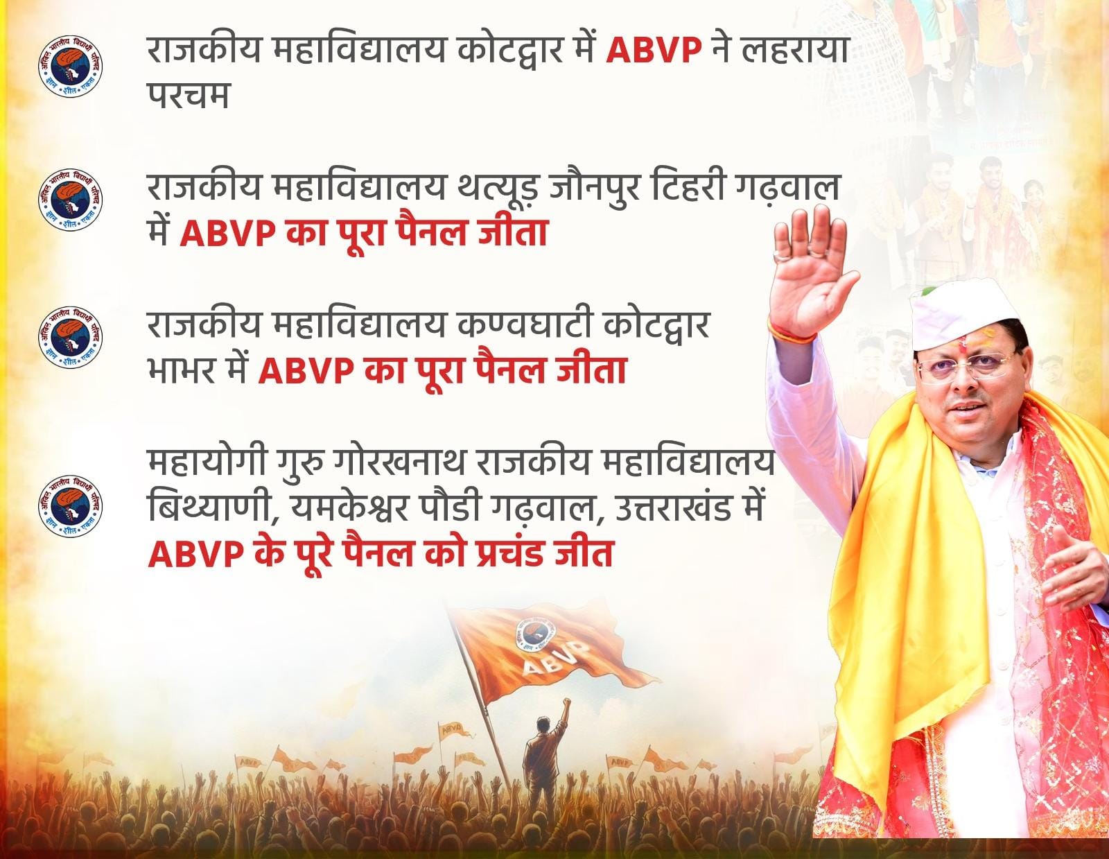 छात्रसंघ चुनावों में अखिल भारतीय विद्यार्थी परिषद (ABVP) को मिली बड़ी और ऐतिहासिक जीत ने साबित कर दिया कि युवाओं का झुकाव भाजपा और उसकी नीतियों के पक्ष में है। खासतौर पर Gen-Z ने अपने वोट से यह संदेश दिया है कि वह मुख्यमंत्री पुष्कर सिंह धामी के नेतृत्व पर भरोसा रखते हैं और सरकार के कामकाज को समर्थन देते हैं।