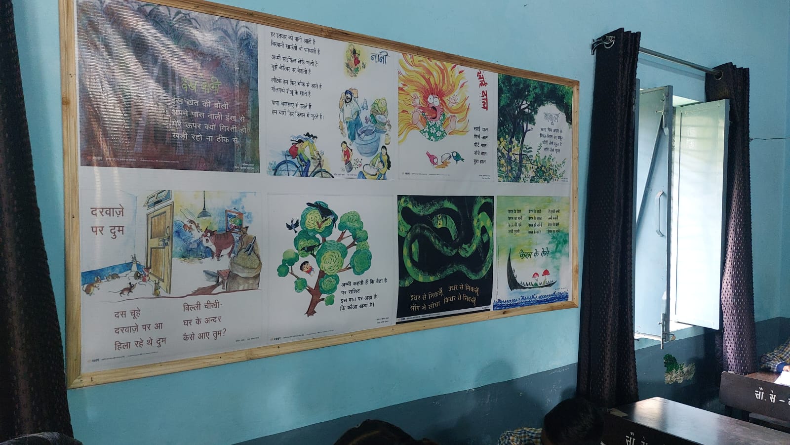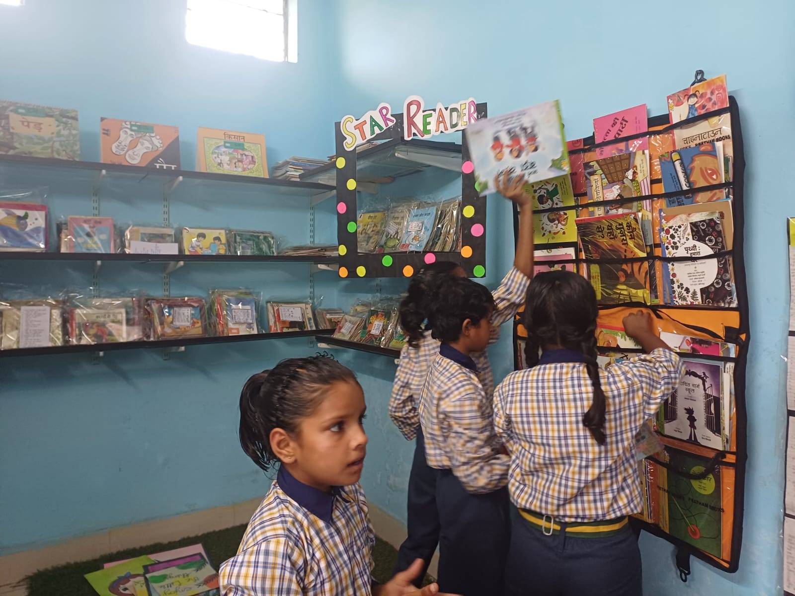 पुस्तकालय और रीडिंग कॉर्नर को आकर्षक ढंग से सजाया गया है। पुस्तकालय के बाहर “स्टार रीडर सेल्फी कॉर्नर” बनाया गया है, जो बच्चों को अधिक पुस्तकें पढ़ने के लिए प्रोत्साहित करता है। महीने में सबसे अधिक पुस्तकें पढ़ने वाले बच्चों को “स्टार रीडर” का पुरस्कार दिया जाता है। बच्चों द्वारा लिखी गई कहानियों को दीवार पत्रिका के रूप में पुस्तकालय की दीवारों पर प्रदर्शित किया जाता है, जिसे समय-समय पर बदला जाता है। यह वातावरण प्रिंट-रिच बनाने में मदद करता है और बच्चों में रचनात्मकता का विकास करता है।