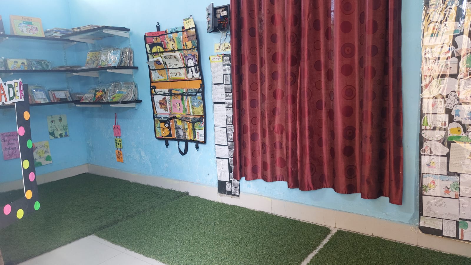 पुस्तकालय का भौतिक वातावरण बच्चों को आकर्षित करता है। फर्श पर टाइल्स लगी हैं और बैठने के लिए कृत्रिम घास का उपयोग किया गया है, जिससे बच्चे आराम से बैठकर पढ़ाई कर सकते हैं। पुस्तकें बच्चों की पहुंच में हैं, और सभी अलमारियां उनकी ऊंचाई के अनुसार व्यवस्थित की गई हैं। रीडिंग कॉर्नर में भी पुस्तकें बच्चों के अनुसार सजाई गई हैं, जो उन्हें पढ़ने के लिए प्रेरित करती हैं।