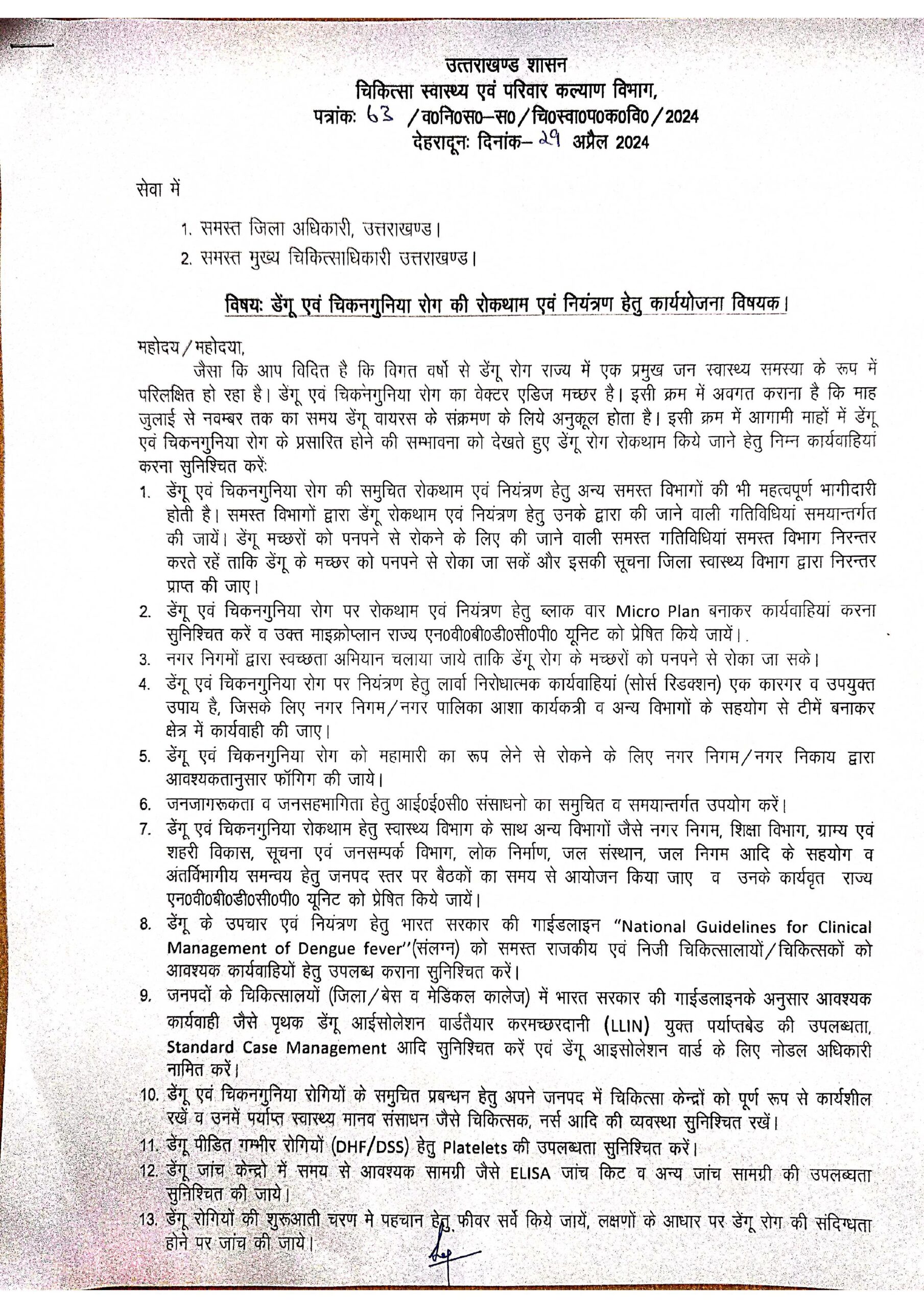- डेंगू के उपचार एवं नियंत्रण हेतु भारत सरकार की गाईडलाइन “National Guidelines for Clinical Management of Dengue fever” (संलग्न) को समस्त राजकीय एवं निजी चिकित्सालायों/चिकित्सकों को आवश्यक कार्यवाहियों हेतु उपलब्ध कराना सुनिश्चित करें।