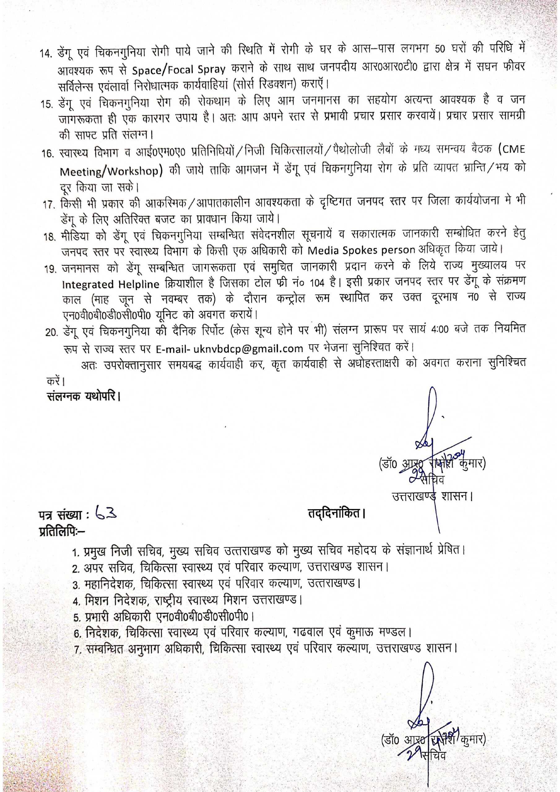 - डेंगू एवं चिकनगुनिया की दैनिक रिर्पोट (केस शून्य होने पर भी) संलग्न प्रारूप पर सायं 4:00 बजे तक नियमित रूप से राज्य स्तर पर E-mail- uknvbdcp@gmail.com पर भेजना सुनिश्चित करें। अतः उपरोक्तानुसार समयबद्ध कार्यवाही कर, कृत कार्यवाही से अधोहस्ताक्षरी को अवगत कराना सुनिश्चित करें।