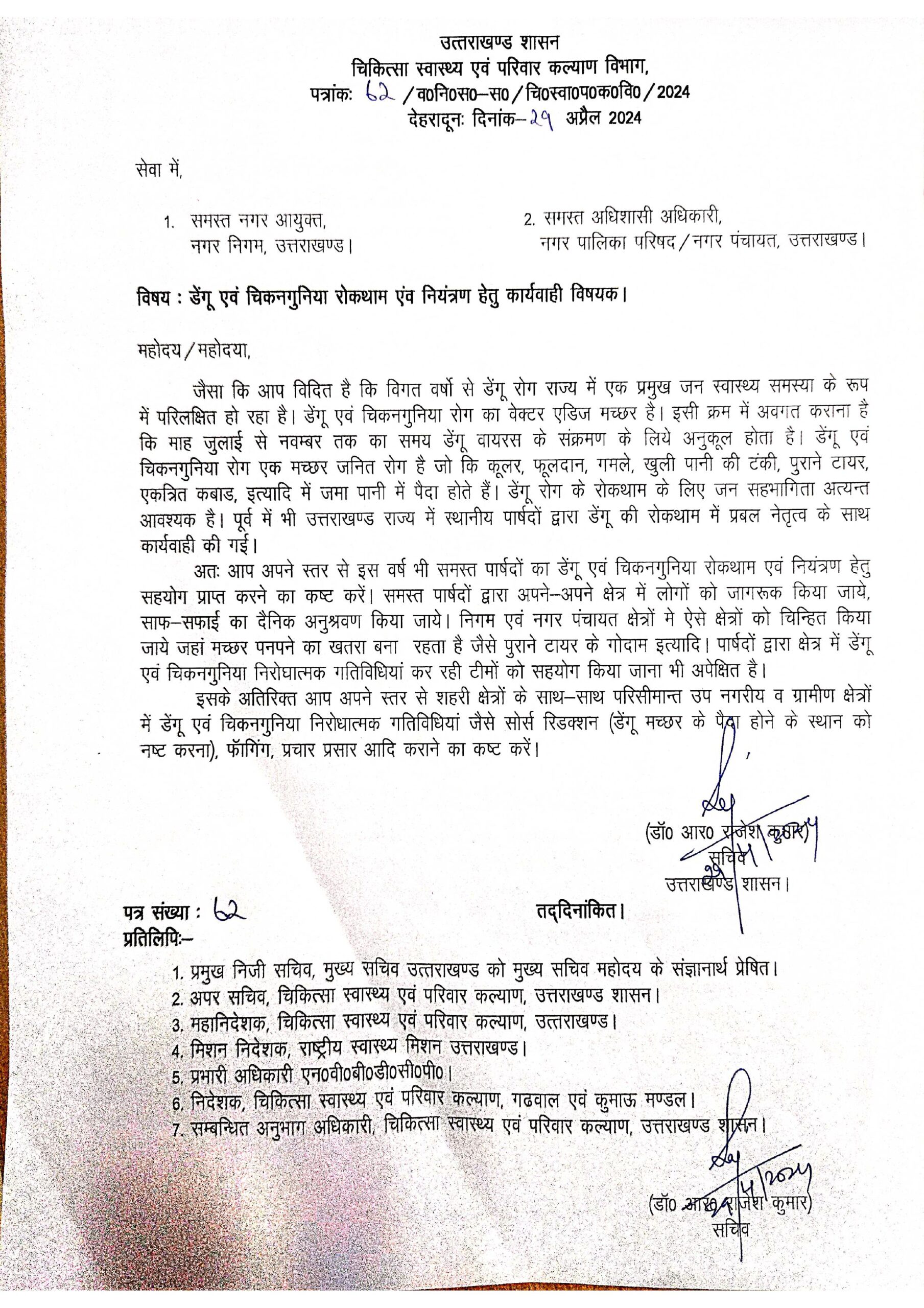 - डेंगू और चिकनगुनिया को लेकर स्वास्थ्य विभाग का अर्लट, स्वास्थ्य सचिव डॉ आर राजेश कुमार ने जारी की 20 बिन्दुओं की गाइडलाइंस