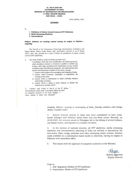 - सभी ओटीटी प्लेटफॉर्म्स को पाकिस्तान मूल के वेब सीरीज़, फिल्में, गाने, पॉडकास्ट और अन्य डिजिटल कंटेंट को हटाने का आदेश दिया गया है, चाहे वह मुफ्त हो या सब्सक्रिप्शन मॉडल पर।