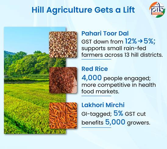 पहाड़ी तूर दाल, लाल चावल और लखौरी मिर्च पर जीएसटी घटाकर 5% करने से पहाड़ी उत्पादों को बढ़ावा मिला है, जिससे 13 पहाड़ी जिलों के छोटे किसानों को मदद मिली है।