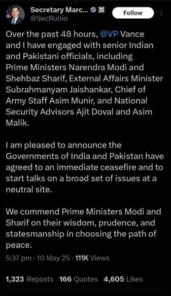 रुबियो के अनुसार, “भारत और पाकिस्तान की सरकारों ने न केवल युद्धविराम पर सहमति जताई है, बल्कि भविष्य के लिए एक व्यापक मुद्दों पर बातचीत शुरू करने पर भी सहमति बनी है। यह वार्ता एक निष्पक्ष स्थान पर होगी।” उन्होंने दोनों प्रधानमंत्रियों की “बुद्धिमत्ता, दूरदर्शिता और शांति के रास्ते पर चलने की statesmanship” की प्रशंसा की।