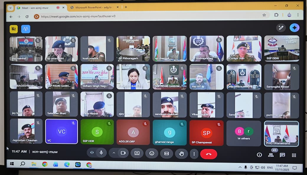 देहरादून : अपर पुलिस महानिदेशक अपराध एवं कानून व्यवस्था उत्तराखण्ड डॉ. वी. मुरुगेशन द्वारा आज गढ़वाल एवं कुमाऊं रेंज सहित एसटीएफ एवं समस्त जनपदों के वरिष्ठ/पुलिस अधीक्षकों के साथ वीडियो कॉन्फ्रेंसिंग के माध्यम से एक उच्च स्तरीय अपराध एवं कानून व्यवस्था समीक्षा बैठक आयोजित की गई। बैठक में राज्य में कानून व्यवस्था को सुदृढ़ बनाए रखने तथा अपराध नियंत्रण की दिशा में प्रभावी रणनीति अपनाने हेतु विस्तृत समीक्षा की गई। अपर पुलिस महानिदेशक द्वारा सभी अधिकारियों को समन्वित एवं संवेदनशील दृष्टिकोण के साथ कार्य करने के निर्देश दिए गए।
