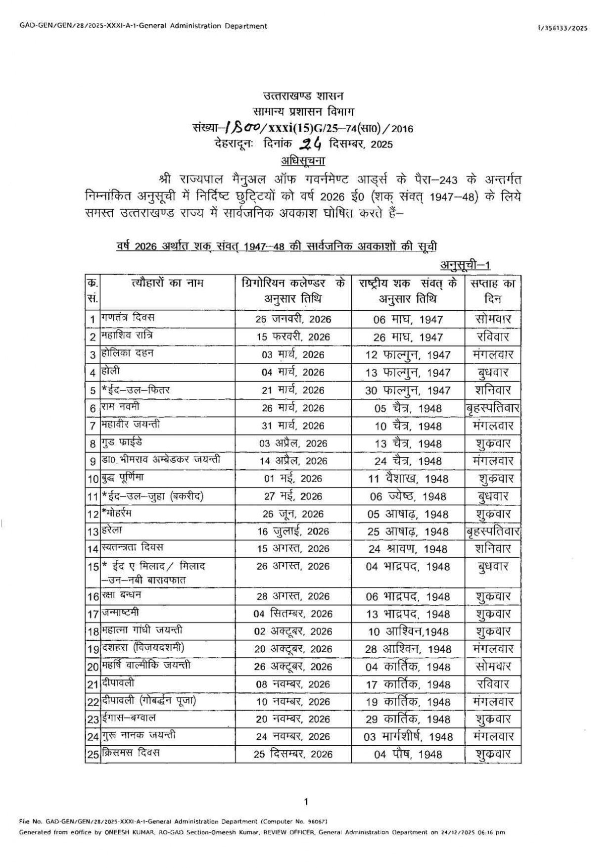 देहरादून: उत्तराखंड में आगामी वर्ष 2026 के लिए शासन ने सार्वजनिक अवकाश का कैलेंडर जारी कर दिया है।