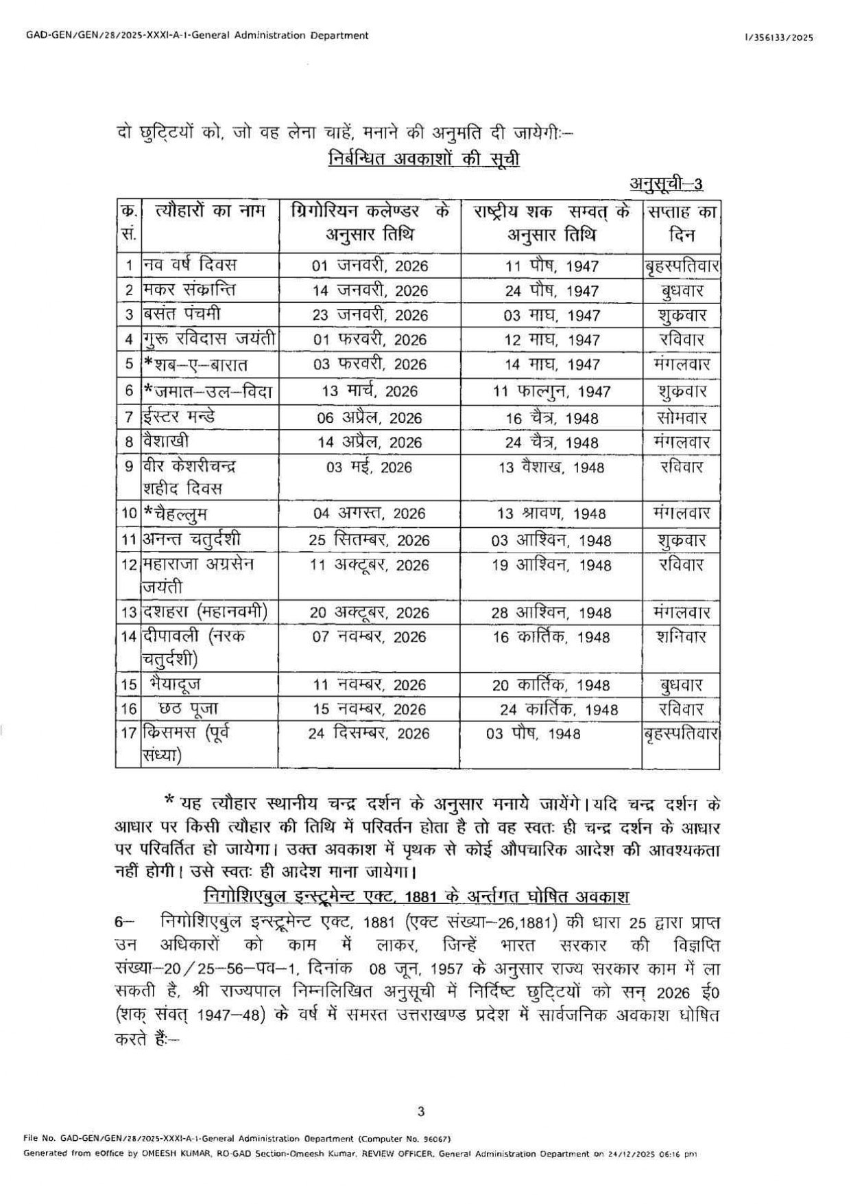 देहरादून: उत्तराखंड में आगामी वर्ष 2026 के लिए शासन ने सार्वजनिक अवकाश का कैलेंडर जारी कर दिया है।