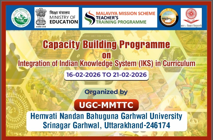 श्रीनगर : भारतीय ज्ञान परम्परा(IKS) के पाठ्यक्रम में प्रभावी एकीकरण के उद्देश्य से 16 फरवरी 2026 से 21 फरवरी 2026 तक एक विशेष क्षमता निर्माण कार्यक्रम का आयोजन किया जा रहा है। यह कार्यक्रम यूजीसी-मालवीय मिशन टीचर्स ट्रेनिंग सेंटर,  हे.न.ब. गढ़वाल विश्वविद्यालय श्रीनगर द्वारा  आयोजित होगा, जिसका कार्यक्रमस्थल – अकादमिक क्रियाकलाप केन्द्र चौरास परिसर रहेगा।