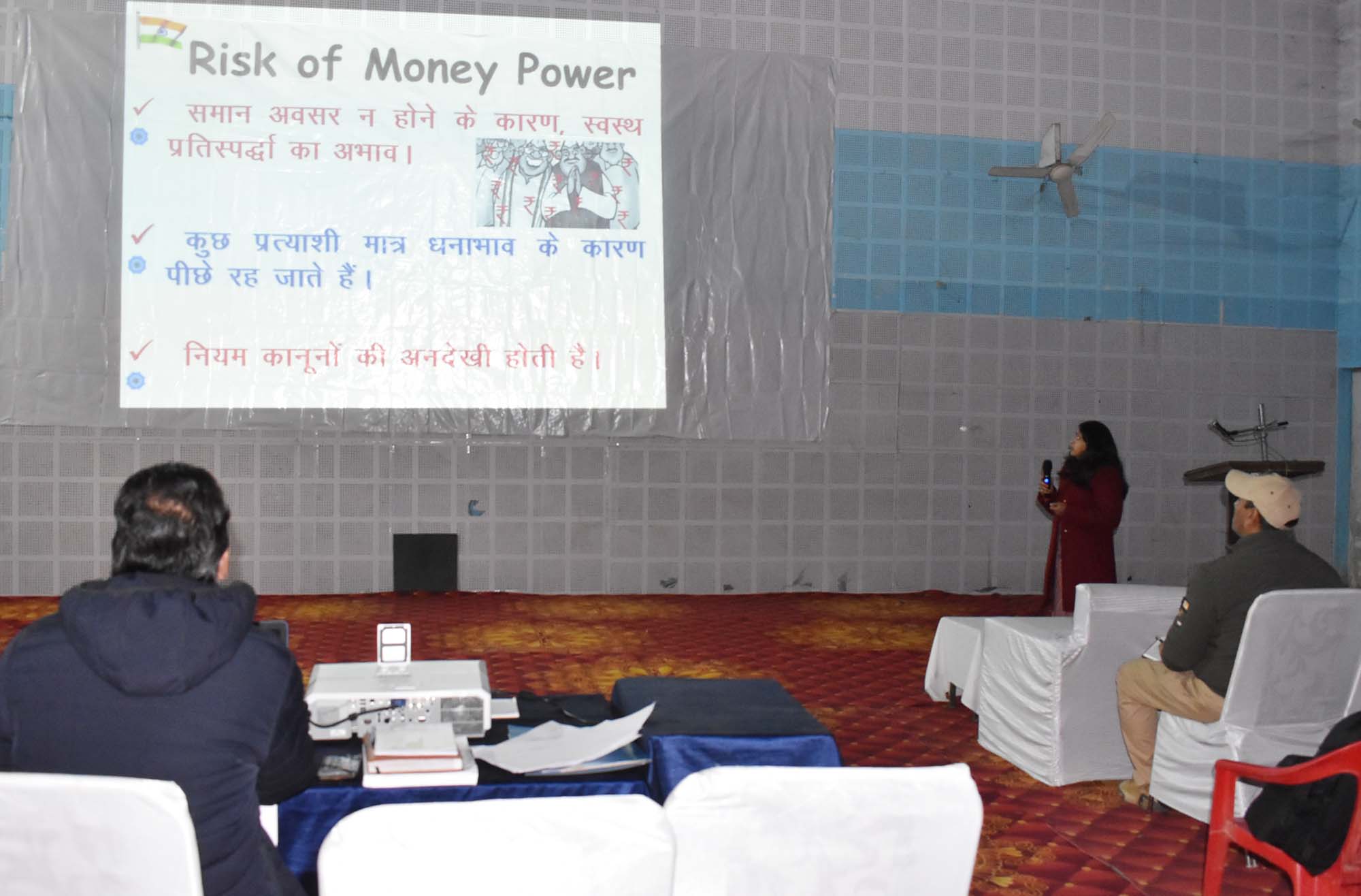 एटीओ महिला सिंह गढिया ने आयोग द्वारा व्यय लेखा हेतु निर्धारित प्रारूपों की जानकारी देते हुए बताया कि निर्वाचन में हो रहे सभी प्रकार के व्यय की अनिवार्य रूप से रिपोर्टिंग होनी आवश्यक है। निर्वाचन के दौरान प्रत्याशियों द्वारा किये जा रहे व्यय पर पैनी नजर रखते हुए पोस्टर, बैनर, प्रचार में उपयोग होने वाले वाहनों तथा अन्य चुनाव सामग्री पर होने वाले खर्च का सम्पूर्ण लेखा तैयार किया जाए। उन्होंने व्यय लेखा टीम को सतर्कता एवं निष्पक्षता के साथ कार्य करते हुए आयोग के दिशा निर्देशानुसार निर्धारित प्रपत्रों में व्यय लेखा विवरण की पूरी रिपोर्ट उपलब्ध कराने को कहा। इस दौरान सी विजिल एप पर दर्ज शिकायतों के निस्तारण के संबंध में भी प्रशिक्षण दिया गया। प्रशिक्षण के दौरान व्यय अनुवीक्षण कार्य हेतु नियुक्त सभी टीमों के अधिकारी एवं कार्मिक उपस्थित थे।