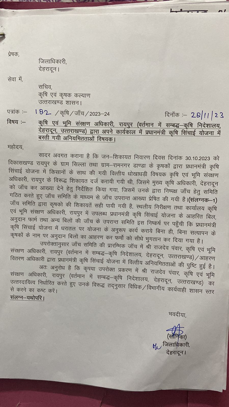 देहरादून : जिलाधिकारी सोनिका की अध्यक्षता में 30 अक्टूबर 2023 को आयोजित जनसुनवाई कार्यक्रम में विकासखण्ड रायपुर के ग्राम सिल्ला एवं रामनगर डांडा के कृषकों द्वारा प्रधानमंत्री कृषि सिंचाई योजना में अनियमितता की शिकायत की गई थी। जनसुनवाई में किसानों द्वारा तत्समय कार्यरत कृषि एवं भूमि संरक्षण अधिकारी रायपुर के विरूद्ध वित्तीय धोखाधड़ी किये जाने की शिकायत करते हुए सम्बन्धित के विरुद्ध कार्यवाही की मांग की गई थी।