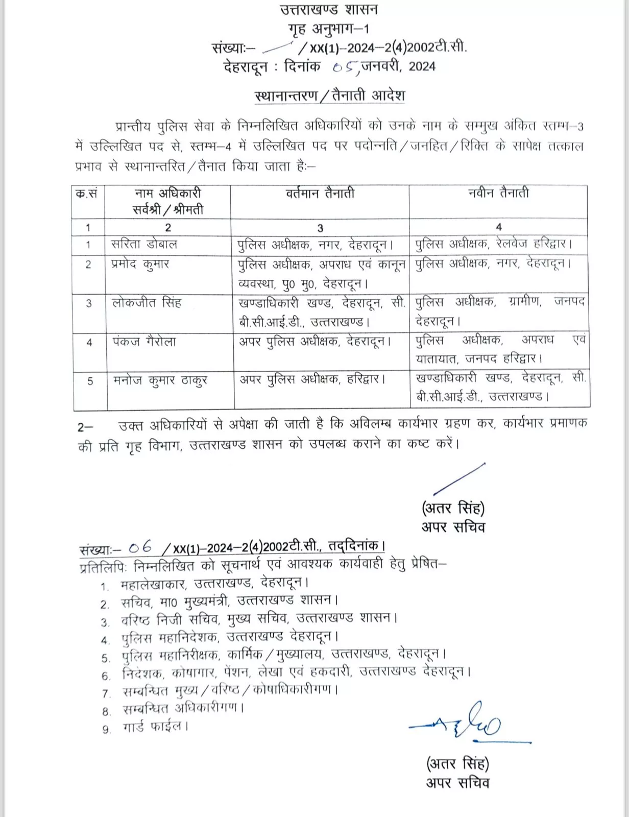 देहरादून : पुलिस महकमे में बड़ा फेरबदल हुआ है। शासन ने कई जिलों के पुलिस अधीक्षक बदले हैं। शुक्रवार को इसकी लिस्ट भी जारी कर दी गई है । आदेश के मुताबिक एसपी सिटी सरिता डोबाल को पुलिस अधीक्षक रेलवेज हरिद्वार की जिम्मेदारी सौंपी है। वहीं प्रमोद कुमार को एसपी सिटी देहरादून बनाया गया है। इसके अलावा लोकजीत सिंह को खंडाधिकारी खंड देहरादून CBCID से पुलिस अधीक्षक ग्रामीण देहरादून में तैनाती मिली है।