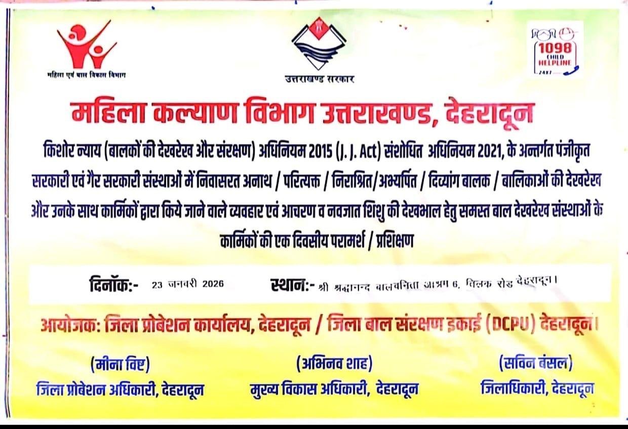 देहरादून : जिलाधिकारी सविन बंसल के निर्देशन में जिला प्रोबेशन अधिकारी, जिला बाल संरक्षण इकाई देहरादून द्वारा महिला कल्याण विभाग उत्तराखण्ड, किशोर न्याय अधिनियम, 2015 के अंतर्गत संचालित राजकीय, स्वैच्छिक बाल गृहों के कार्मिकों तथा चाइल्ड हेल्पलाइन 1098 में कार्यरत कार्मिकों का एक दिवसीय प्रशिक्षण कार्यशाला आयोजित की गई।  इस दौरान जिला प्रोबेशन अधिकारी महिला कल्याण विभाग मीना बिष्ट, अपर मुख्य चिकित्सा अधिकारी डॉ वंदना सेमवाल, उप मुख्य परिवीक्षा अधिकारी महिला कल्याण राजीव नयन, अध्यक्ष बाल कल्याण समिति देहरादून नमिता ममगई, सुधीर गुलाटी, सुभाष चन्द्र गोयल, श्रद्धानंद बाल विनीता आश्रम के अधिष्टाता ने दीप प्रज्वलित कर कार्यशाला का शुभारंभ किया।