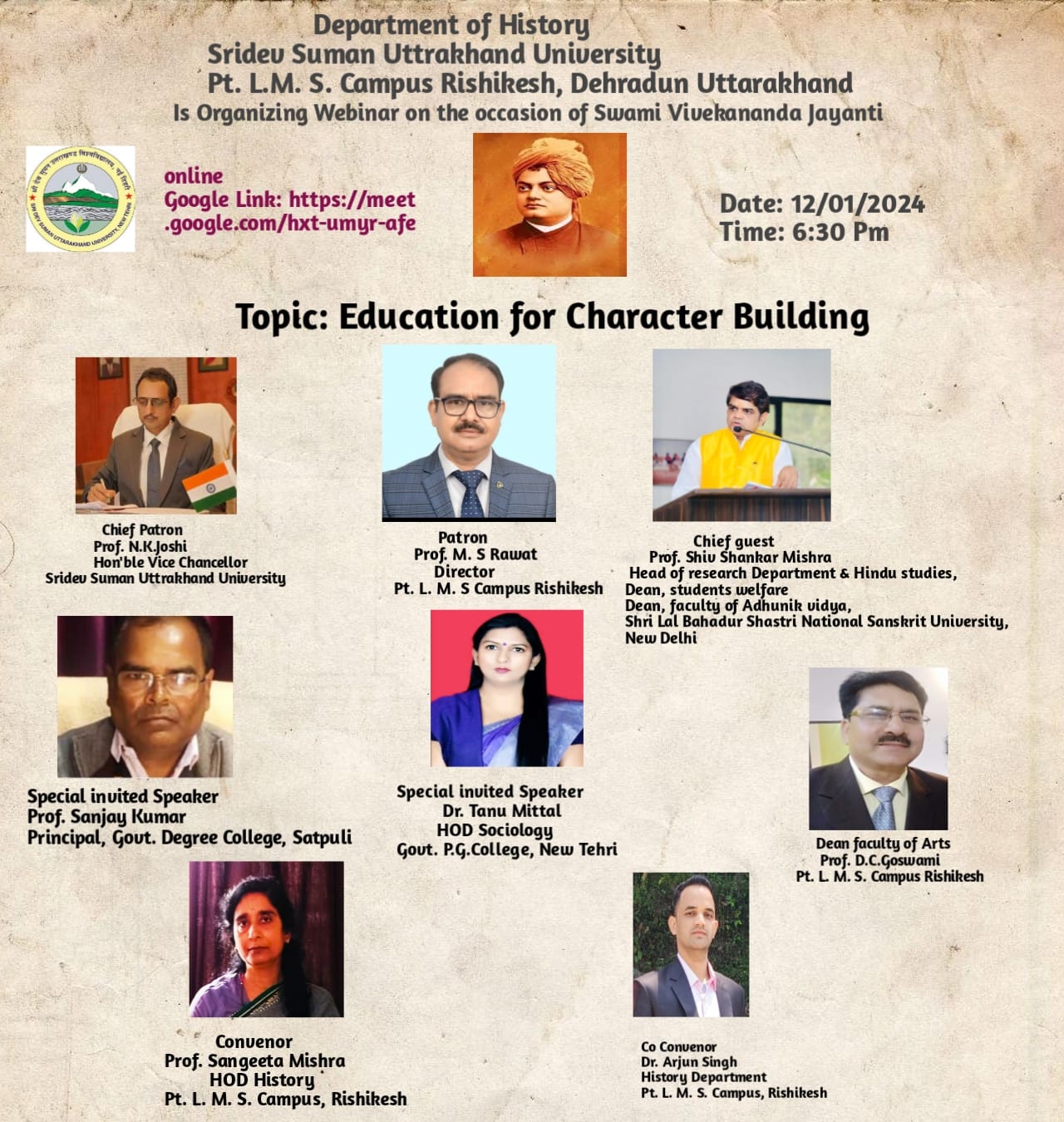 ऋषिकेश : श्री देव सुमन उत्तराखंड विश्वविद्यालय के पंडित ललित मोहन शर्मा कैंपस ऋषिकेश के इतिहास विभाग द्वारा स्वामी विवेकानंद जयंती के अवसर पर ऑनलाइन वेबीनार का आयोजन किया गया। वेबिनार का विषय “चरित्र निर्माण के लिए शिक्षा” था। वेबिनार का शुभारंभ ऋषिकेश कैंपस के निदेशक प्रोफेसर एम.एस. रावत ने किया। वेबीनार के संयोजक प्रो. संगीता मिश्रा एवम सह संयोजक डा. अर्जुन सिंह थे। प्रो. एम.एस. रावत ने वेबीनार के मुख्य अतिथि, मुख्य वक्ता एवं अन्य वक्ताओ का स्वागत किया। प्रो. संगीता मिश्रा ने स्वामी विवेकानंद जी के जीवन इतिहास के सार को बताते हुए सभी अतिथियों का स्वागत किया।