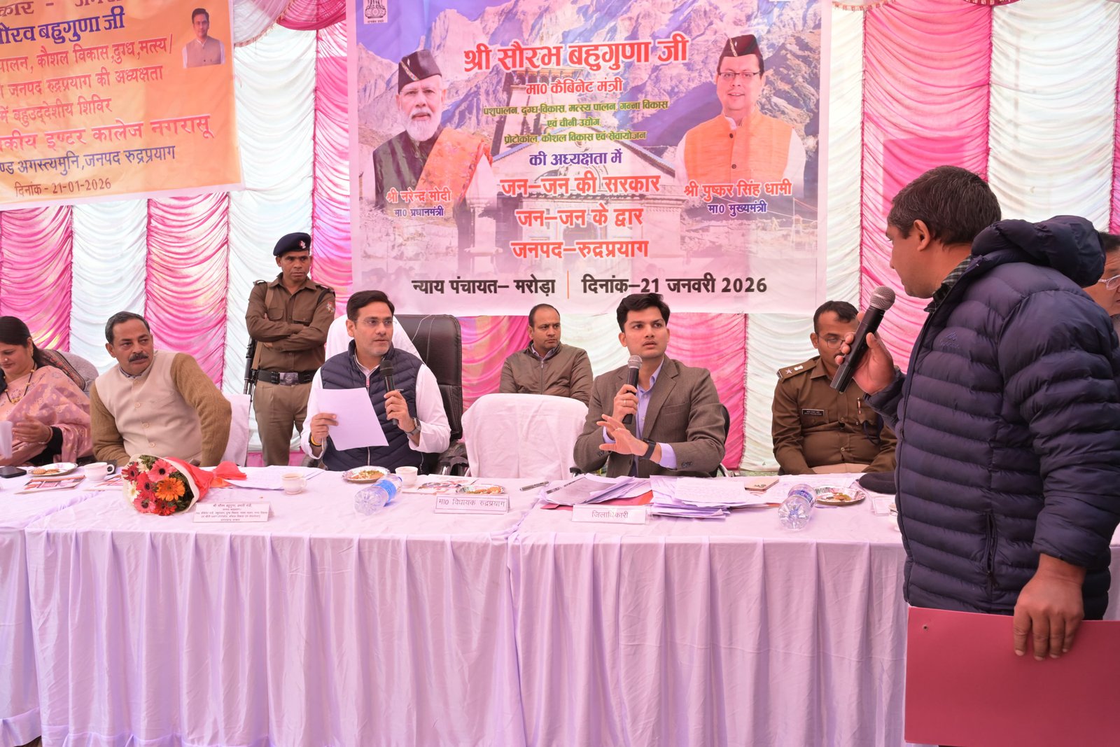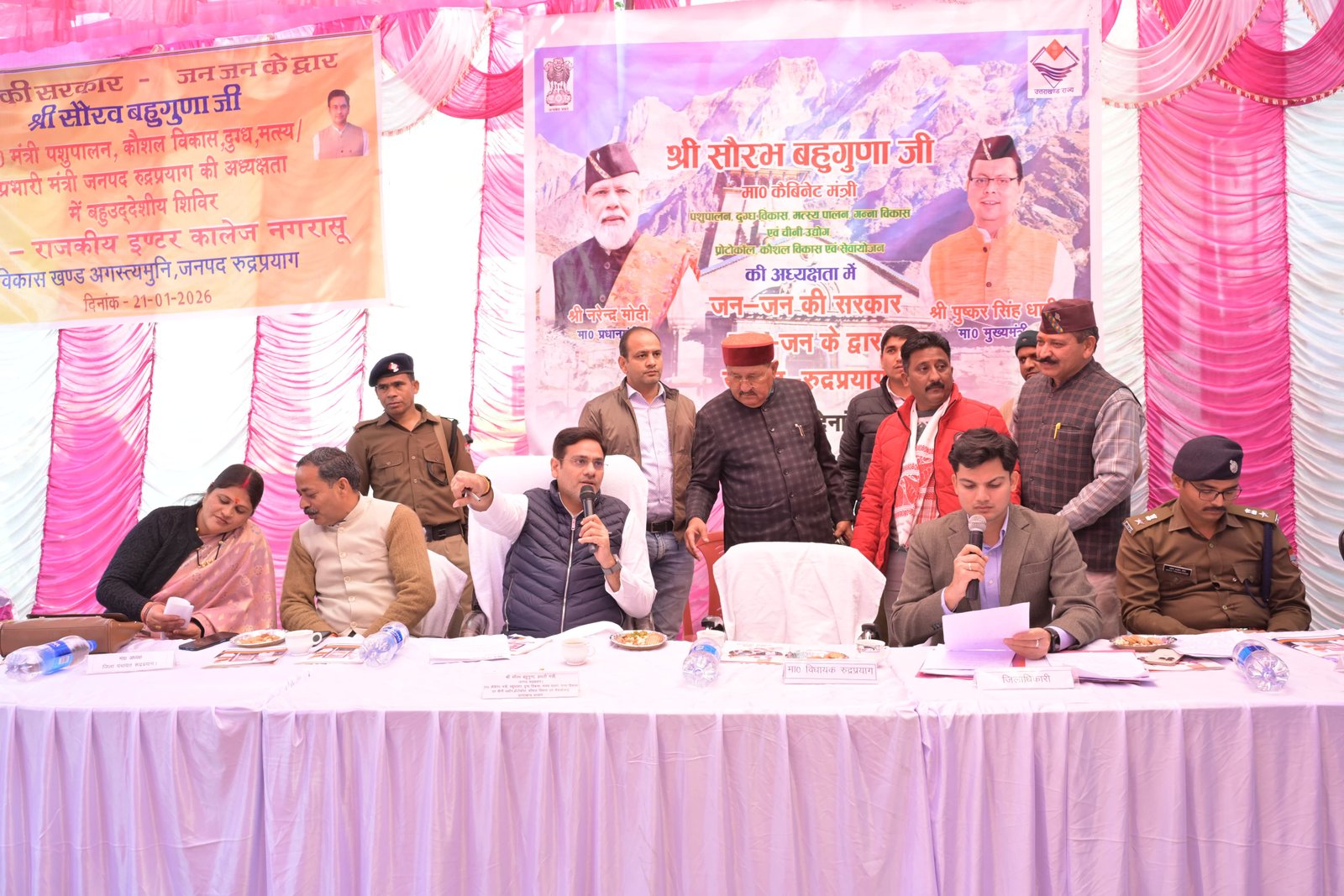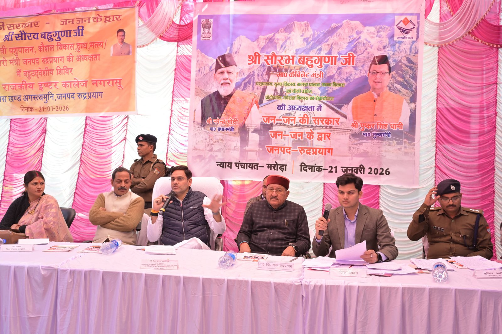 मंत्री (प्रभारी मंत्री, जनपद रुद्रप्रयाग) पशुपालन, दुग्ध विकास, मत्स्य पालन, गन्ना विकास एवं चीनी उद्योग, प्रोटोकॉल, कौशल विकास एवं सेवायोजन विभाग, उत्तराखण्ड सरकार सौरभ बहुगुणा की अध्यक्षता में न्याय पंचायत मरोड़ा अंतर्गत राजकीय इंटर कॉलेज नगरासू (रुद्रप्रयाग) में बहुउद्देशीय शिविर का आयोजन किया गया। शिविर के माध्यम से विभिन्न विभागों द्वारा विभागीय स्टॉल स्थापित कर पात्र लाभार्थियों को केन्द्र एवं राज्य सरकार की योजनाओं की जानकारी दी गई तथा मौके पर ही आवेदन, शिकायत एवं समस्याओं का निस्तारण किया गया।