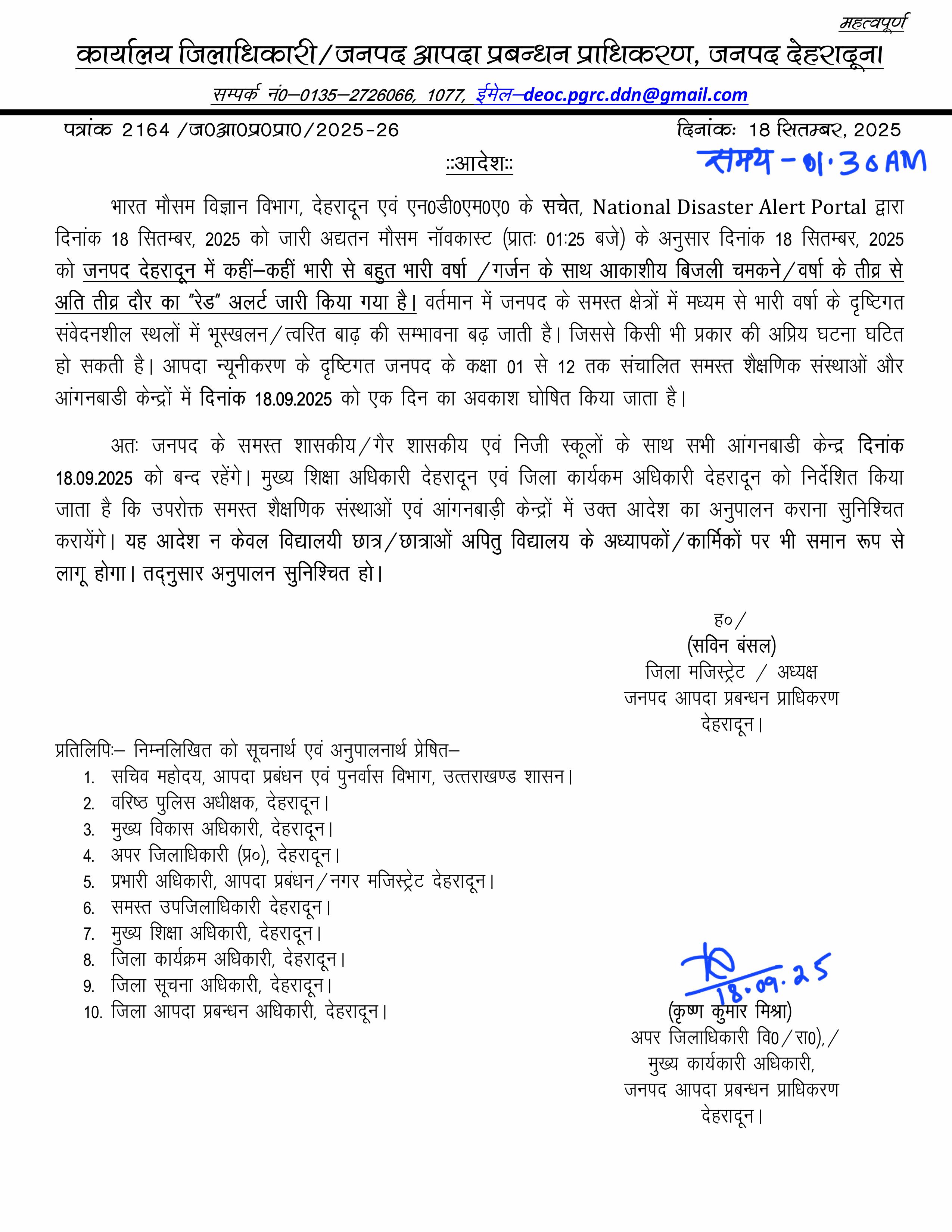 देहरादून। भारत मौसम विज्ञान विभाग, देहरादून एवं एन०डी०एम०ए० के सचेत, National Disaster Alert Portal द्वारा दिनांक 18 सितम्बर, 2025 को जारी अद्यतन मौसम नॉवकास्ट (प्रातः 01:25 बजे) के अनुसार दिनांक 18 सितम्बर, 2025 को जनपद देहरादून में कहीं-कहीं भारी से बहुत भारी वर्षा / गर्जन के साथ आकाशीय बिजली चमकने / वर्षा के तीव्र से अति तीव्र दौर का “रेड” अलर्ट जारी किया गया है। वर्तमान में जनपद के समस्त क्षेत्रों में मध्यम से भारी वर्षा के दृष्टिगत संवेदनशील स्थलों में भूस्खलन / त्वरित बाढ़ की सम्भावना बढ़ जाती है। जिससे किसी भी प्रकार की अप्रिय घटना घटित हो सकती है। आपदा न्यूनीकरण के दृष्टिगत जनपद के कक्षा 01 से 12 तक संचालित समस्त शैक्षणिक संस्थाओं और आंगनबाडी केन्द्रों में दिनांक 18.09.2025 को एक दिन का अवकाश घोषित किया जाता है।