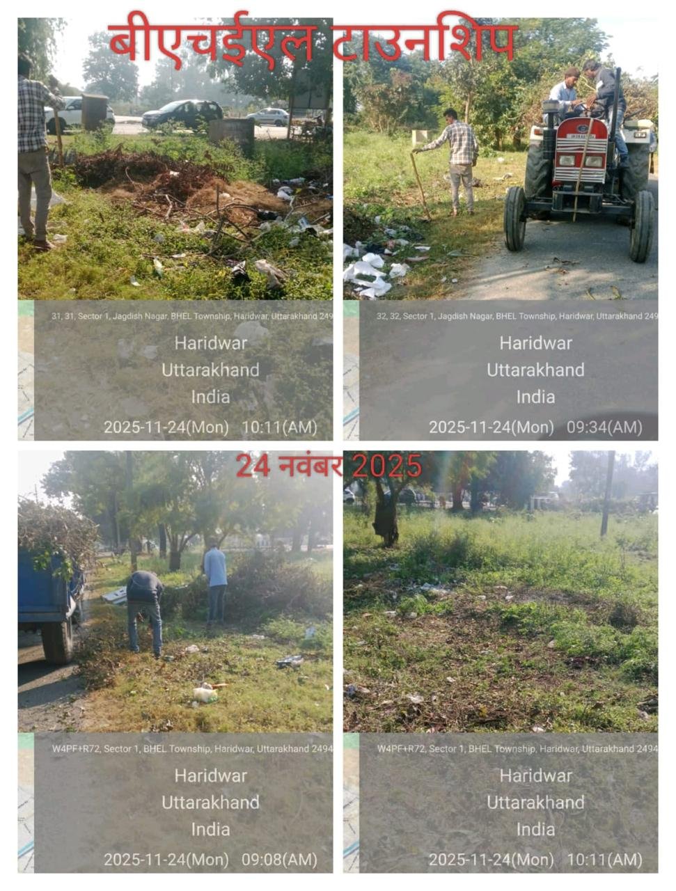ईओ नगर पंचायत झबरेड़ा ने अवगत कराया है कि आज नगर पंचायत झबरेड़ा के क्षेत्रांतर्गत अमर जवान चौक एवं किसान चौक के पास सफाई व्यवस्था कराई गई। बीडीओ बहादराबाद मानस मित्तल ने अवगत कराया है कि सलेमपुर महदूद स्थित हाईवे नियर डेंसू चौक क्षेत्रांतर्गत साफ सफाई व्यवस्था कराई गई। अधिशासी अभियंता एनएचएआई अतुल शर्मा ने अवगत कराया है कि रुड़की बाईपास पर धन्धेदी ख्वाज़्गीपुर गांव की सर्विस रोड पर एवं बहादराबाद बाईपास,ज्वालापुर बाईपास के ऊपर ,रुड़की बाईपास नियर कौर कॉलेज क्षेत्रांतर्गत सफाई व्यवस्था कराई गई तथा पेड़ो की प्लोपिंग ( छटाई)भी कराई गई।