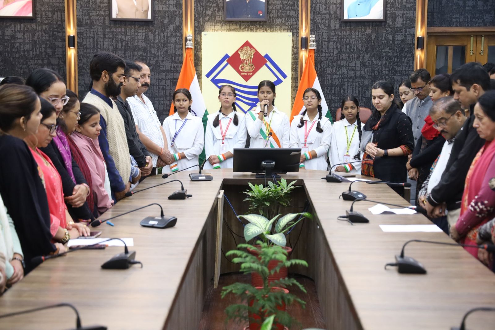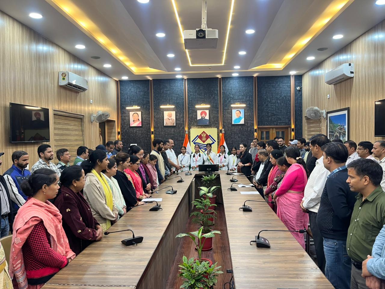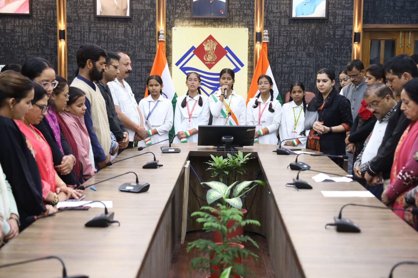 देहरादून : भारत वर्ष के राष्ट्रगीत ‘‘वंदे मातरम्’’ के 150 वर्ष पूर्ण होने के अवसर जनपद के सभी सरकारी, गैर सरकारी कार्यालयों, शिक्षण संस्थानों एवं सामाजिक संगठनों में प्रातः 10 बजे ‘‘वंदे मातरम्’’ का गायन किया गया। जिलाधिकारी सविन बंसल के दिशा निर्देशन में जिला कार्यालय में उप जिलाधिकारी अपूर्वा सिंह की मौजूदगी में क्लेक्ट्रेट परिसर के समस्त अधिकारियों, कार्मिकों एवं श्री गोर्वधन सरस्वती विद्या मंदिर की छात्राओं की उपस्थिति में वंदे मातरम् का सामूहिक गायन किया गया। इस मौके पर देशभक्ति से ओत-प्रोत वातावरण में अधिकारीगण, कार्मिक, शिक्षक, विद्यार्थी सभी उत्साहपूर्वक शामिल हुए।