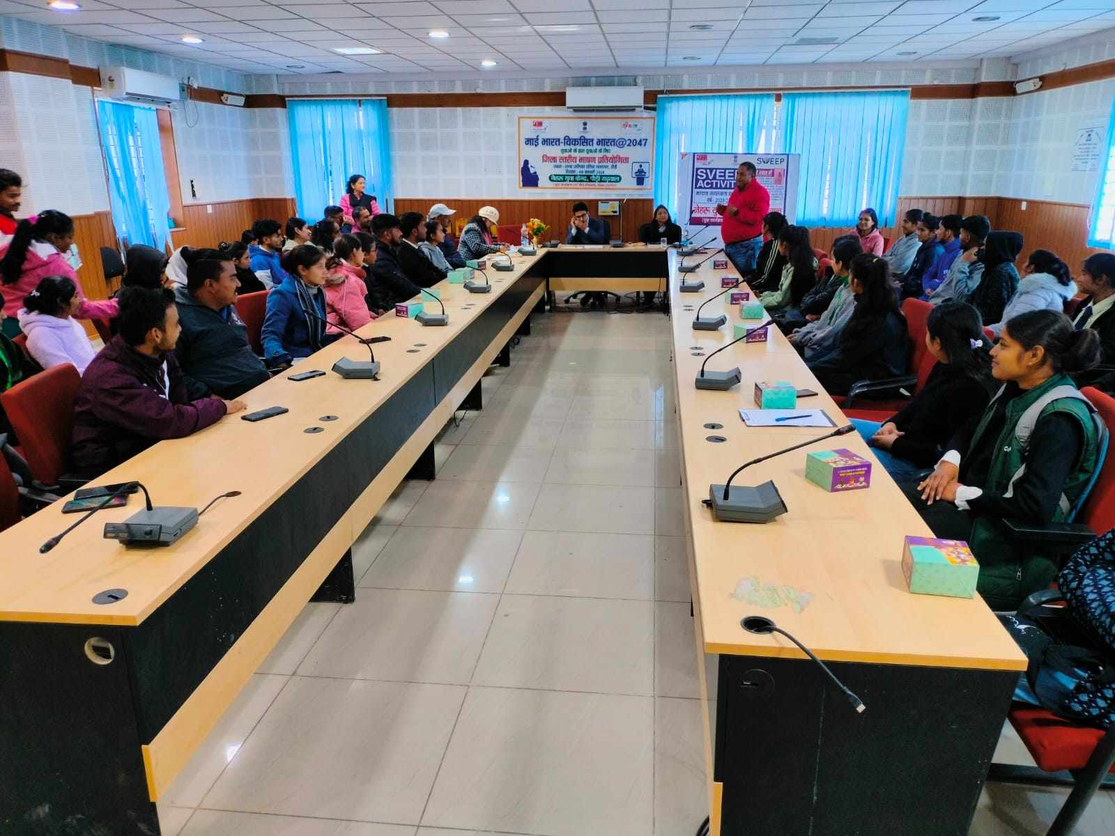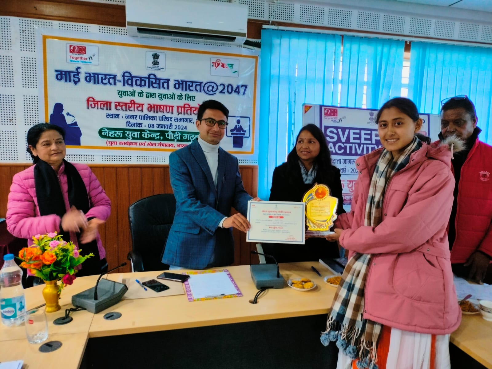 पौड़ी : नेहरू युवा केन्द्र के तत्वाधान में नगरपालिका परिषद् सभागार, पौड़ी में मेरा युवा भारत- विकसित भारत@2047 पर जिला स्तरीय भाषण प्रतियोगिता का आयोजन किया गया। कार्यक्रम में मुख्य अतिथि उपप्रभागीय वनाधिकारी गढ़वाल वन प्रभाग, पौड़ी लक्की शाह ने भाषण प्रतियोगिता के प्रतिभागियों को सम्बोधित करते हुए कहा कि अपनी प्रतिभा को प्रदर्शित करने के लिए नेहरू युवा केन्द्र एक बेहतर मंच प्रदान करता है। विकसित भारत की परिकल्पना तभी साकार होगी जब प्रत्येक युवा नई सोच के साथ अपना योगदान इस मुहिम में देकर राष्ट्रीय विकास में सक्रिय रहें। जिला युवा अधिकारी शैलेश भट्ट ने विकसित भारत की परिकल्पना को युवाओं के मध्य साझा करते हुए भारत सरकार दृष्टिकोण पर चर्चा की साथ ही राष्ट्रीय सड़क सुरक्षा सप्ताह तथा स्वीप कार्यक्रम की जानकारी भी साझा की।