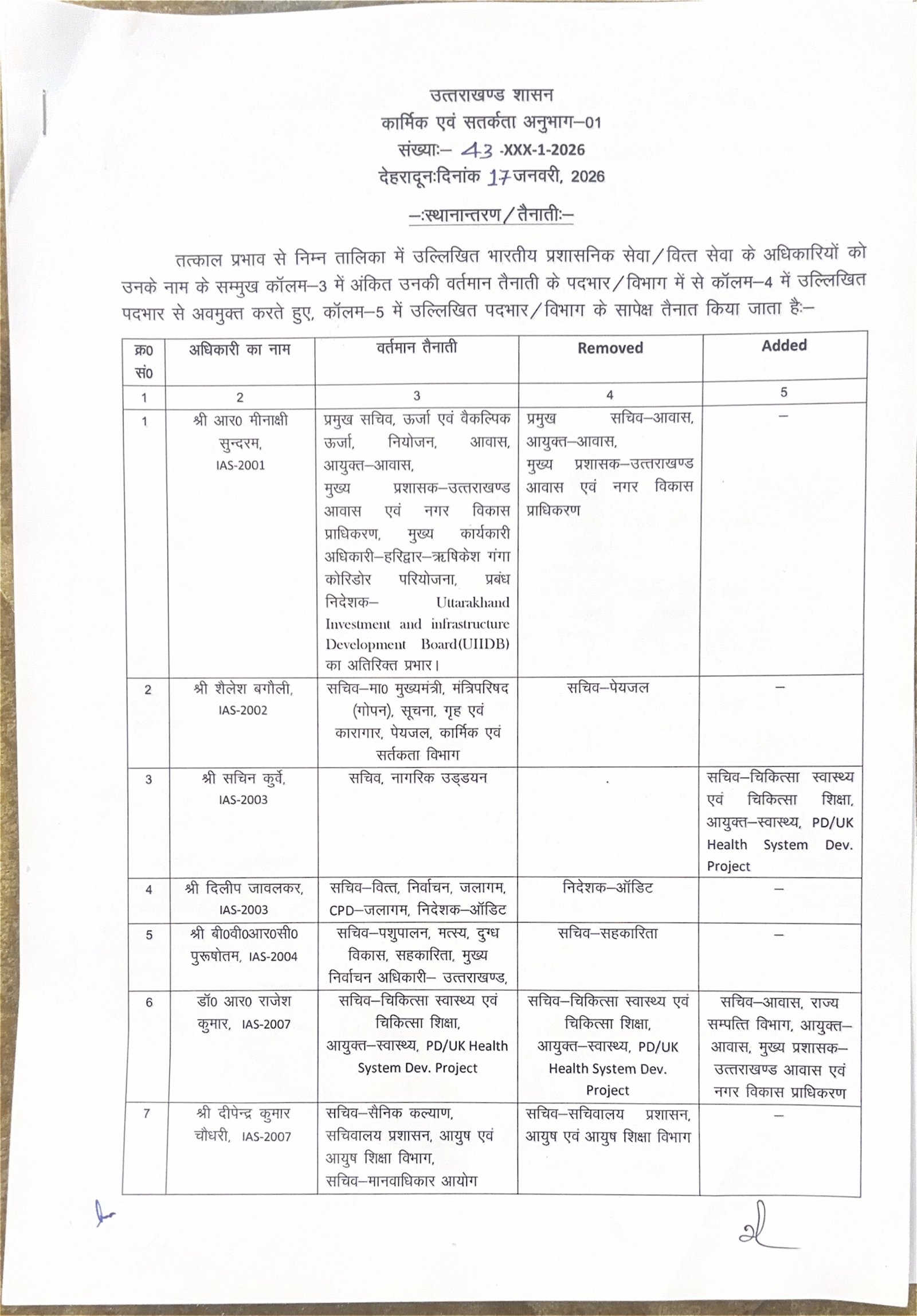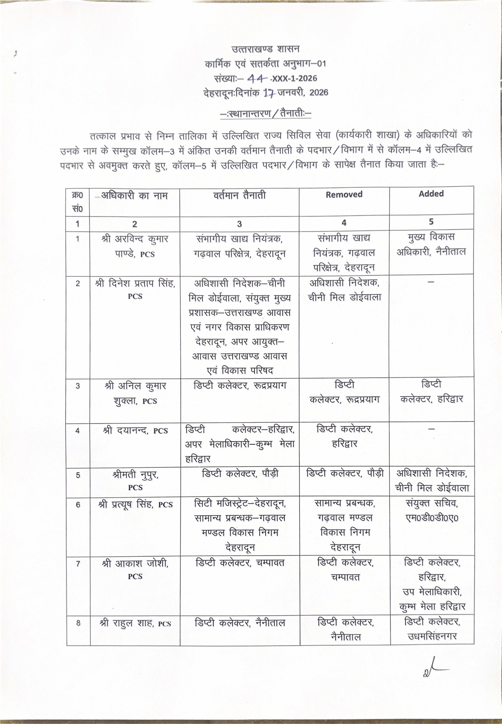 उत्तराखंड शासन ने किए IAS और PCS अधिकारियों के ट्रांसफर, देखें सूचि by vasudevnews January 18, 2026 written by vasudevnews January 18, 2026 Share 0FacebookTwitterPinterestWhatsappदेहरादून : उत्तराखंड शासन ने किए IAS और PCS अधिकारियों के ट्रांसफर, देखें सूचि Share 0 FacebookTwitterPinterestWhatsapp