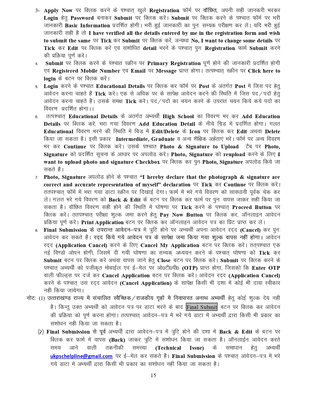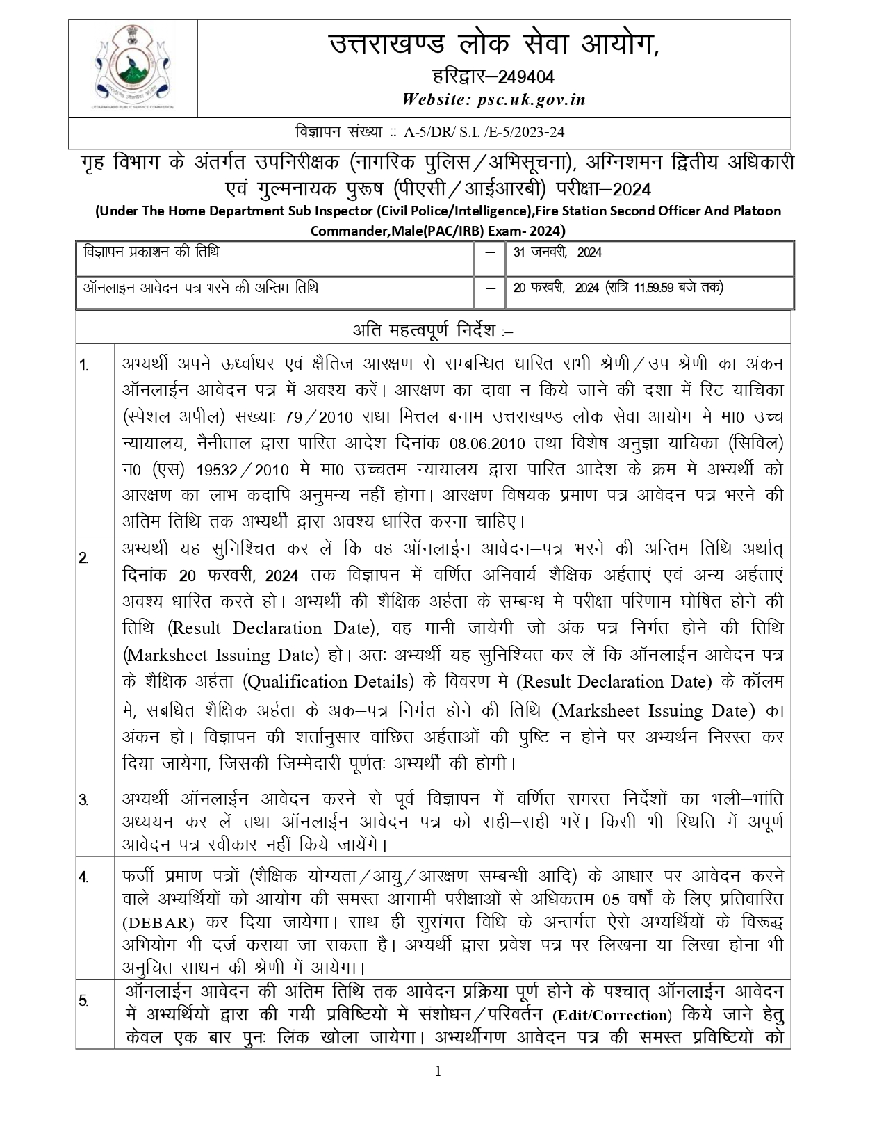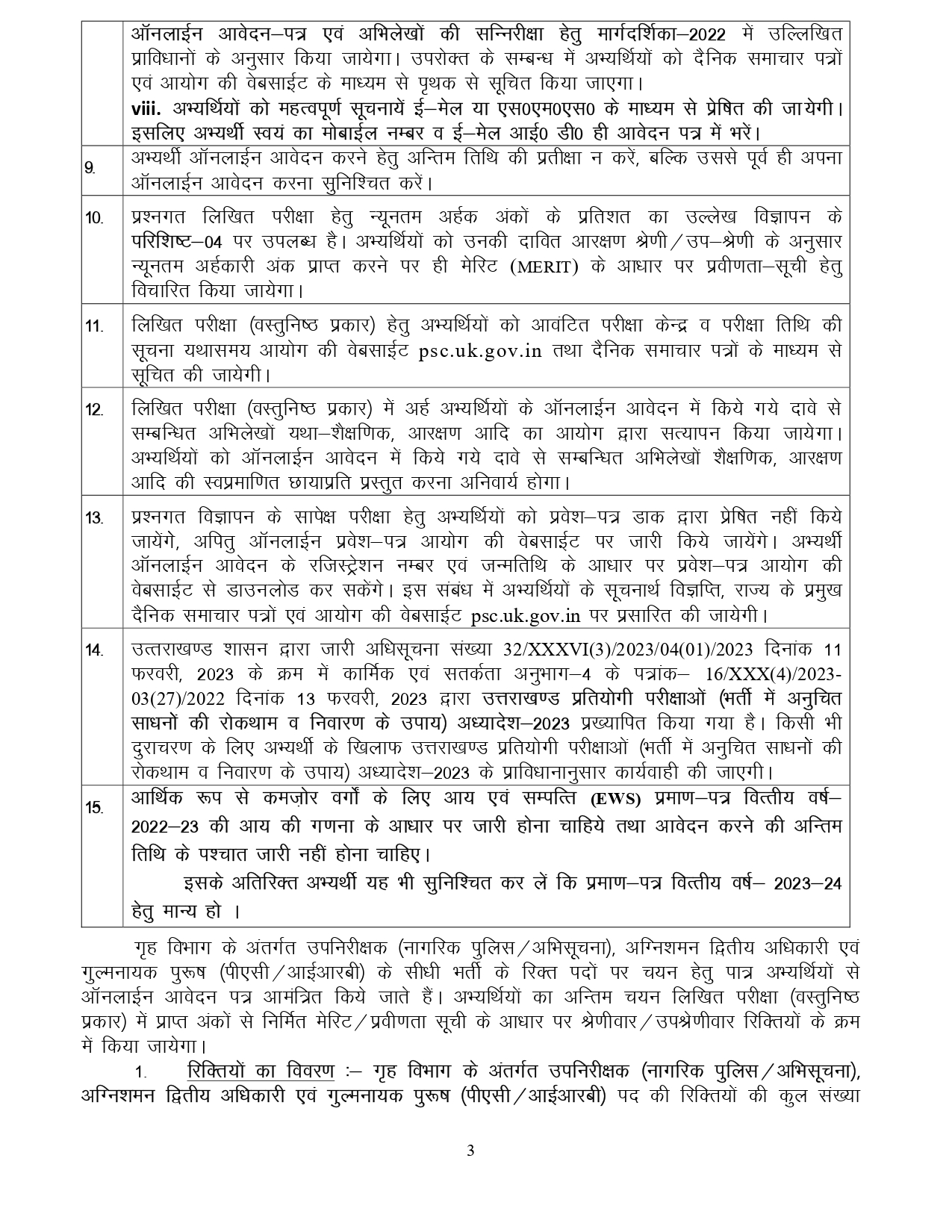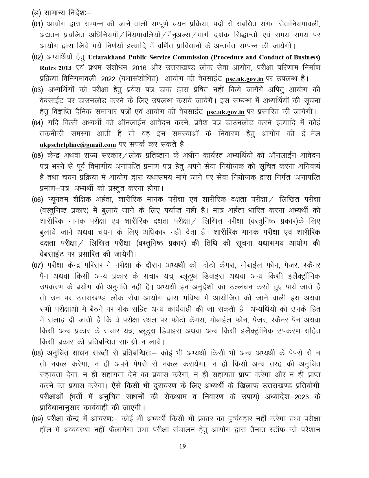 प्रश्नगत पदों हेतु इच्छुक / पात्र अभ्यर्थी ऑनलाइन आवेदन करने से पूर्व आयोग की वेबसाइट psc.uk.gov.in पर प्रसारित विस्तृत विज्ञापन में वर्णित समस्त शर्तों/निर्देशों का भली-भांति अवलोकन करना सुनिश्चित करें। ऑनलाइन आवेदन करते समय उत्पन्न समस्याओं के समाधान हेतु अभ्यर्थी ukpschelpline@gmail.com पर ई-मेल कर सकते हैं।