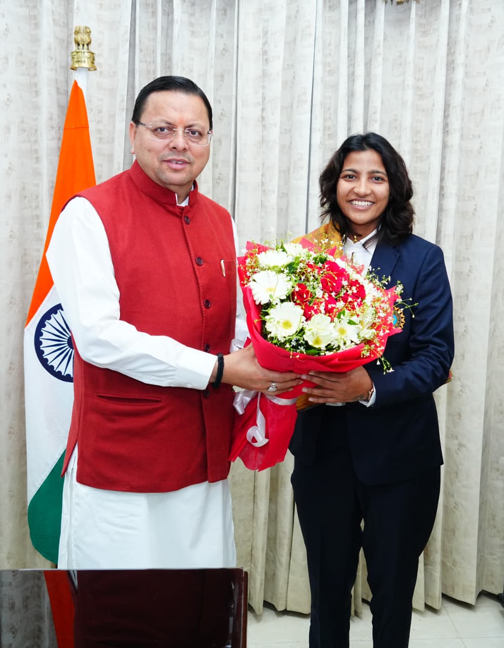 देहरादून : मुख्यमंत्री पुष्कर सिंह धामी से आज मुख्यमंत्री आवास में महिला क्रिकेट विश्व कप विजेता टीम की सदस्य एवं उत्तराखंड की गौरव, क्रिकेटर स्नेह राणा ने शिष्टाचार भेंट की। इस अवसर पर विशेष प्रमुख सचिव खेल अमित सिन्हा भी उपस्थित रहे। मुख्यमंत्री धामी ने स्नेह राणा को भारतीय महिला क्रिकेट टीम की शानदार जीत पर हार्दिक बधाई देते हुए कहा कि यह उपलब्धि पूरे देश और उत्तराखंड के लिए गर्व का विषय है। उन्होंने कहा कि स्नेह राणा ने अपने उत्कृष्ट प्रदर्शन और संघर्षशीलता से देश और प्रदेश का नाम विश्व पटल पर रोशन किया है।