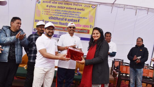 चमोली : लोकसभा चुनाव में अधिक से अधिक मतदाताओं की भागीदारी सुनिश्चित करने के उद्देश्य से सुव्यवस्थित मतदाता शिक्षा एवं निर्वाचन सहभागिता कार्यक्रम (स्वीप) के तहत जनपद चमोली में अभिनव माध्यम से जन-जन को मतदान का महत्व समझाया जा रहा है। इस कड़ी में रविवार को स्वीप टीम के सदस्यों द्वारा पुलिस मैदान गोपेश्वर में क्रिकेट प्रतियोगिता आयोजित कर युवाओं को मतदान का महत्व बताया गया। स्वीप कार्यक्रम के नोडल अधिकारी अभिनव शाह ने खिलाडियों से आवाह्न किया कि आगामी लोकसभा चुनाव में वोट डालने अवश्य जाए और अपने अभिभावकों को भी मतदान के लिए प्रेरित करें। उन्होंने कहा कि लोकतंत्र में एक-एक वोट का महत्व है। स्वस्थ लोकतंत्र की नींव रखने और देश के विकास में अपनी भागीदारी के लिए चुनाव के इस महापर्व में वोट देकर अपना योगदान अवश्य करें। इस दौरान उन्होंने खिलाड़ियों को स्वीप टीर्सट, कैप वितरित की। खेल के दौरान स्वीप सेल्फी प्वाइंट भी आकर्षण का केंद्र रहा। स्वीप सेल्फी प्वाइंट पर खिलाड़ियों ने खूब फोटो खिंचवाए।