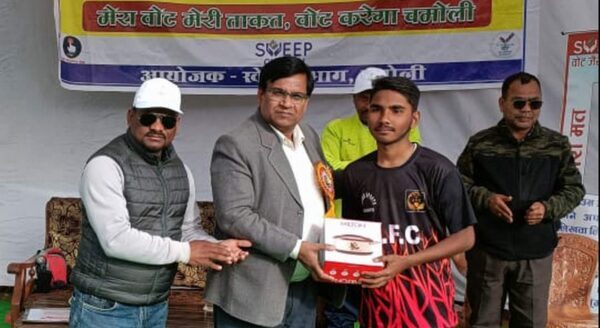 इससे पूर्व पहले प्रथम मुकाबले में जीएफसी0 गोपेश्वर ने प्रशासन चमोली को 5-1 से पराजित किया। मैच के दौरान विजेता टीम की ओर से दीक्षांत ने मैच के दूसरे और 10वें मिनट में दो व अजय राज ने 27वें मिनट व 29वें मिनट दो गोल तथा अंश ने 23वेंं मिनट में एक गोल किया। दूसरा मैच में हिमालयन बॉइज ने पीजी कॉलेज गोपेश्वर को 7-1 से पराजित कर अगले चरण में प्रवेश किया, जिसमें विजेता टीम की ओर से मनीष ने 4वें मिनट, राहुल ने 24वें मिनट में क्रमशः 1-1 गोल, विशाल ने मैच के 25वें व 26वें मिनट में दो व दीपक ने 30वें व 21वें मिनट दो गोल तथा अनश ने 23वेंं मिनट में एक गोल का योगदान दिया। दूसरी ओर राजकीय पॉलिटेक्निक संस्थान गौचर की ओर से मेला मैदान में क्रिकेट स्पर्धा का आयोजन कर युवा मतदाताओं को शत प्रतिशत मतदान के लिये जागरूक किया। जबकि रोपा, चलथर, गैरसैंण सहित विभिन्न स्थानों पर मतदाता गोष्ठी आयोजित कर मतदाताओं का शपथ दिलाई गई। इस अवसर पर स्वीप के सह समन्वयक डा. दर्शन नेगी, आरपी सती, खेल विभाग के वीएस चौधरी, एनएस नेगी, राजपाल सिंह, रमेश पंखोली, दिव्या सती कैलखुरा, संगीता नेगी, नवीन कुंवर, आशीष कुमार, देवेन्द्र सिंह, विक्रम सिंह, लखपत सिंह आदि मौजूद थे।