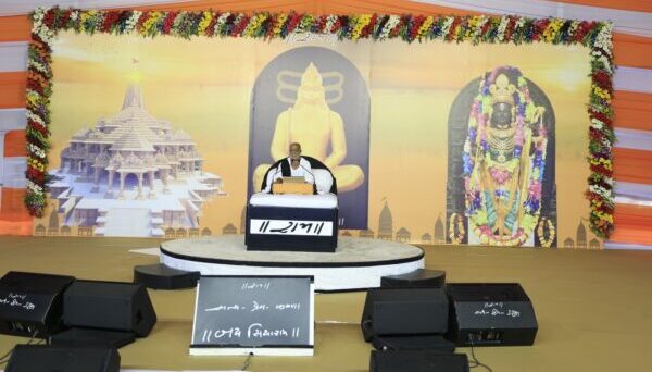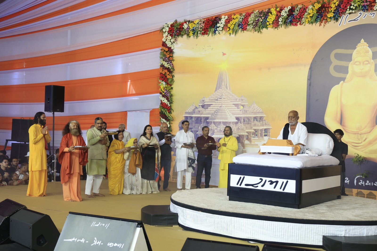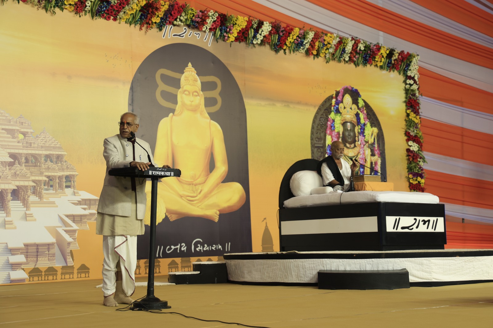 कथा के अंतिम दिन मुरारी बापू ने श्रीराम के चरणों में प्रणाम करते हुए कहा की मानस राममंदिर केवल अयोध्या का नहीं, यह मेरे अंतःकरण की प्रवृत्ति का निवेदन है, केवल पृथ्वी का मंदिर भी नहीं, यह त्रिभुवन का मंदिर है। यहां ध्वज फहरेगी तो आसमान झुकेगा, घंटनाद होगा तो देश नृत्य करेगा। यह रामचरितमानस राम मंदिर है। एक ही सत्य को अनेक कोने से, अनेक रूप से देखते हैं, परिक्रमा करते हैं। ये त्रिभुवन गुरु शिव ने गाया है। जैसे पहले बताया था कि मंदिर की नींव होती है, द्वार, गर्भ गृह, शिखर और दंड होता है, ध्वजा फहरती है। सातों सोपान में बालकांड नींव है। अयन का मतलब धाम, मंदिर, भवन, प्रासाद होता है।